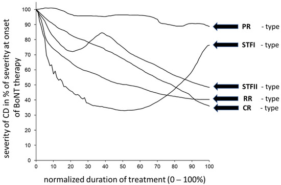 Patients´ drawings of the course of CD severity after the onset of botulinum toxin therapy (CoDA graphs) differ considerably. A total of 54 out of 66 patients (=81.8%; RR + CR + STF + OR subgroups) experienced a good response during the initial phase of treatment. This corresponds with previously reported initial responder rates of more than 70%, with an improvement of more than 25% [19,24]. In a review from 2003, a benefit from BoNT therapy was reported in 70–85% of CD patients [25]. The long-term outcome from BoNT therapy depends on a variety of factors: the genetic constellation of the patient (see next paragraph), the BoNT preparation used [23,26], the dose per session, the length of the treatment cycle, the clinician’s knowledge about optimal injection sites for muscles (detailed in [27,28]), and the duration of the treatment [26].