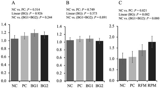 The PC decreased (p < 0.05) the ADG of pigs during phase 1 and tended to decrease (p = 0.050) the ADG of pigs during the overall period compared with NC. Increasing the supplementation of feed additive tended to linearly increase the ADG of pigs fed mycotoxin-contaminated diets during phase 1 (p = 0.085), phase 3 (p = 0.097), and overall period (p = 0.060). The PC decreased (p < 0.05) the ADFI of pigs compared with NC during phase 1, phase 2, phase 3, and the overall period. Increasing the supplementation of feed additive tended to linearly increase the ADFI of pigs fed mycotoxin-contaminated diets during phase 3 (p = 0.079) and overall period (p = 0.066). The BG (BG1 + BG2) tended to decrease (p = 0.063) the ADFI of pigs in phase 1. The PC decreased (p < 0.05) G:F of pigs during phase 1, whereas it tended to increase (p = 0.081) the G:F of pigs during phase 3 compared with NC. Increasing the supplementation of feed additive tended to linearly increase (p = 0.064) the G:F of pigs fed mycotoxin-contaminated diets during phase 1. The BG (BG1 + BG2) tended to increase (p = 0.064) the G:F of pigs in phase 2 compared with NC. The PC tended to increase (p = 0.071) fecal score of pigs in phase 1 (Table 2). Increasing the supplementation of feed additive linearly decreased (p < 0.05) the fecal score of pigs fed mycotoxin-contaminated diets in phase 1 and phase 2.