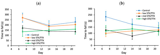 On day 7, the time to fall of male mice was greater for the control group in comparison to any of the other three treatments (p < 0.05), while on day 14 the time to fall was lower for mice dosed with STX/TTX at the medium dose rate in comparison to the control.