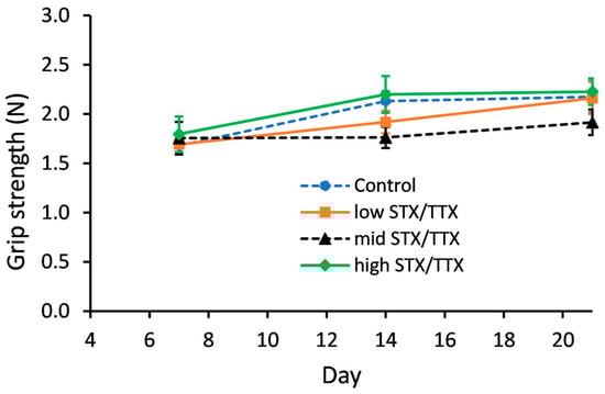 There were no statistically significant differences between the grip strength of mice dosed with the control matrix and those dosed with STX/TTX at any of the three different dose rates on any of the measurement days.