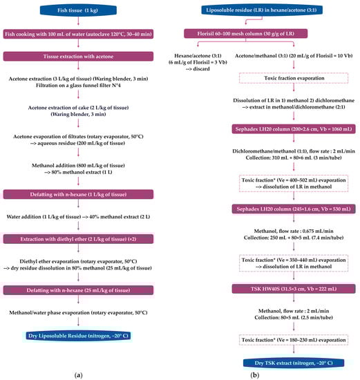 Flow diagram of the C-CTX extraction and purification stages used to study Caribbean fish toxin profiles using LC-MS-radiolabeled-ligand binding [,,] and to isolate C-CTX-1 and -2 [,]. (a) Extraction stage, (b) purification stage. * Toxicity was assessed using the mouse bioassay (MBA) on the fractions bordering toxic peaks. The fractions were evaporated under nitrogen, and 1/100 or 1/50 of each fraction was dissolved in 0.6 mL of 1% Tween 60 for IP (intraperitoneal) injection in mice. Vb = bed volume, Ve = elution volume.