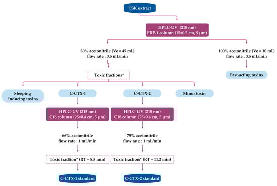 Flow diagram of C-CTX purification using HPLC-UV for the isolation and characterisation of C-CTX-1 and -2 standards from TSK (Toyopearl® HW 40S) extracts of horse-eye jack tissues [,]. * Fractions were evaporated under nitrogen, and up to 10% of the collected fractions was dissolved in 0.6 mL 1% Tween 60 for IP injection in mice (MBA). Ve: elution volume, RT: retention time.