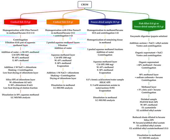 To improve the efficiency of ciguatoxin extraction and HPLC-MS/MS detection, ciguatoxin rapid extraction methods (CREM) sampling small amounts of flesh (<5.0 g), have been applied to P-CTXs analysis [,,,] (Figure 4). Lewis et al. [] developed the first CREM that used a novel approach to CTX extraction, and the clean-up and was optimized to: