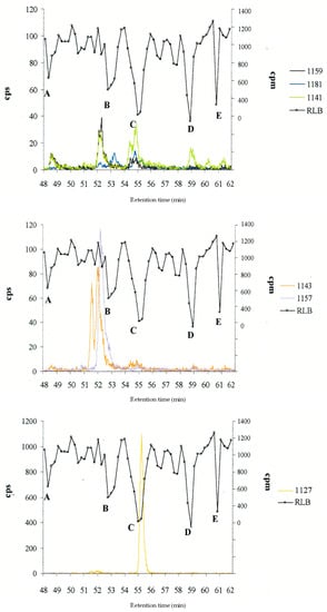 Subsequently, an extract of an inedible horse-eye jack, known as CL5 [], was analysed using HPLC-MS and radiolabeled-ligand binding assay (RLB) simultaneously (unpublished data from []). This additional combined analysis revealed five peaks of binding to sodium channels (A to E) (Figure 5 and Table 2). Unfortunately, some peaks co-eluted (peaks A, B and C), which did not allow for sodium channel affinity to be assigned to specific congeners (Table 2). Moreover, in the toxic fraction A containing C-CTX-1159, two other pseudomolecular ions with unusual masses for CTX were detected: [M+H]+ at m/z 859.42 with sodium and potassium adducts and four water losses, and [M+H]+ at m/z 811.47 with only four water losses (Table 2).