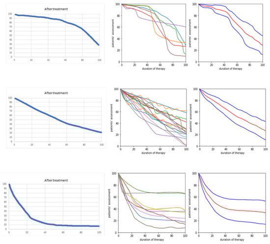 The outcome assessed by the patients (IMPQ) was significantly different across the three RO, CO and DO subgroups. The best outcome at recruitment (IMPQ: MV = 77.9% (SD: 8.1)) was reported by the RO group, and the lowest (MV = 57.0%; SD: 23.2%) was reported by the DO group (see Table 1). The initial dose (ITSUI; p < 0.009) and actual dose per session (ATSUI; p < 0.01)) were also significantly different across the three patient subgroups. The lowest IDOSE (MV = 105; SD = 72) and ADOSE (MV = 199; SD = 108) by far were used in the CO group (see Table 1 and Figure 1).