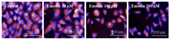 Regarding the morphological changes induced with emodin, the cell area, cytoplasm area, compactness, and outer/inner membrane values were dose-dependently increased. In addition, the nucleus area, nucleus roundness, nucleus intensity, and cytoplasm intensity values were dose-dependently decreased. Distinct morphological changes appeared as the concentration increased, but most of the properties were not statistically significant at the 25 μM concentration of emodin (Table 1). Moreover, the number of cells at the same magnification decreased following treatment with emodin, and nuclei condensation and mitochondrial distribution occurred (Figure 3). HCS data numerically show that as apoptosis occurs, the nuclei of apoptotic cells appear somewhat smaller than nuclei in a normal state [25], and condensed and aggregated chromatin are observed as bright fluorescence due to DNA condensation [25].