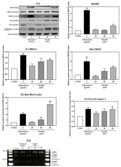 Relative protein expression levels of (B) BiP, (C) IRE1α, (D) CHOP, (E) Bax/Bcl-2 ratio, and (F) cleaved caspase-3 after treatment with emodin (10, 20, and 30 μM) for 24 h. (A) Relative protein expression levels of ER stress and apoptosis-related markers measured with a Western blot analysis. (B–F) The relative protein expression levels were increased with emodin treatment. (G) The effects of emodin on the expression of sXBP1 cut with PstI. TM (2 μg/mL) served as the positive control. VCON, vehicle control; TM, tunicamycin. The data are shown as the mean ± SD from three independent experiments. * p < 0.05 and ** p < 0.01 (t-test) compared with the VCON group. The statistical power was ≥0.8, which means that a non-significant result is likely to be not really significant.