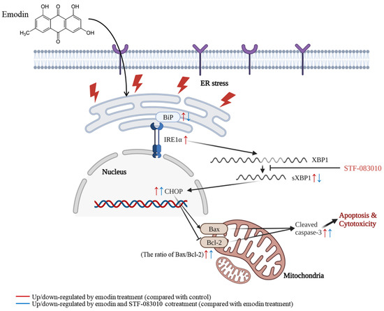The present study confirmed that emodin causes ER stress and apoptosis in human hepatocyte HepG2 cells and particularly causes ER stress through the IRE1α–XBP1 axis (Figure 8). Emodin decreased the metabolic activity of HepG2 cells and increased the relative protein expression of ER stress and apoptosis markers. Furthermore, emodin caused apoptosis in a dose-dependent manner, as confirmed with flow cytometry. To determine whether the IRE1α–XBP1 pathway is involved in emodin-induced ER stress, cells were cotreated with emodin and STF-083010, followed by measurement of the protein expression of ER stress and apoptosis markers. Compared with the relative protein expression levels induced by the single treatment with emodin, BiP was downregulated, and CHOP, the Bax/Bcl-2 ratio, and cleaved caspase-3 were upregulated.
