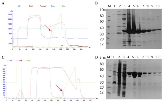 (A) Purification profile of rETXY196E-C protein, with the red arrow indicating the target protein peak. (B) SDS-PAGE analysis of rETXY196E-C protein. M: molecular weight marker; lanes 1–2: induced bacterial culture, sonicated pellet and supernatant; lane 3: flow-through; lanes 4–10: target protein. (C) Purification profile of GST-ETX protein, with the red arrow indicating the target protein peak. (D) SDS-PAGE analysis of GST-ETX protein. M: molecular weight marker; lanes 1–2: induced bacterial culture, sonicated pellet and supernatant; lane 3: flow-through; lanes 4–10: target protein.