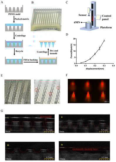 Mechanical properties of the PLGA-DDAB dMN was evaluated using a force-displacement testing machine (MARK-10, Copiague, NY, USA). The MNs were placed horizontally on the platform of the testing machine with the needle tips facing upward. The force gauge probe was set to move downwards at a uniform speed of 0.1 mm/s until the maximum force of 20 N·m was reached. The force-displacement curves were analyzed, and the needle tip deformation was observed using an optical microscope (Olympus DP71, Tokyo, Japan) after force application.