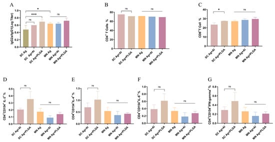 (A) IgG2a/IgG1 ratio of specific antibodies in mouse serum on day 35. (B) Percent CD4+ T cells. (C) Percent CD8+ T cells. (D) Percent CD4+CD154+ IL-2+. (E) Percent CD4+CD154+IL-4+. (F) Percent CD4+CD154+IL-6+. (G) Percent CD4+CD154+IFN-gamma+. * p < 0.05, *** p < 0.001. MN: microneedle patch; SC: subcutaneous injection.