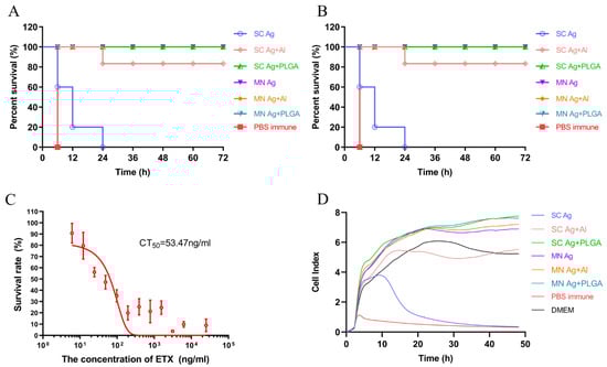 The in vitro neutralization experiment included both animal and cell experiments. The immune sera of each of the six groups of mice were mixed with GST-ETX toxin, incubated at 37 °C for 30 min, and then injected into blank mice and co-cultured with cells to observe the survival of mice and cells. Both mouse survival (Figure 6B) and cell proliferation curves (Figure 6D) showed that the immune sera of the SC immunization Ag group did not protect either mice or cells, and the immune sera of the SC immunization Ag + Al group protected mice but did not effectively protect cells. The immune sera of the SC immunization Ag + PLGA group and the three groups of mice immunized with dMN were able to protect naive mice from 10 × LD50 GST-ETX toxin after a 20-fold dilution and protect cells from the attack of 20 × CT50 GST-ETX toxin (see Figure 6C). These results are consistent with those of the in vivo neutralization experiment.