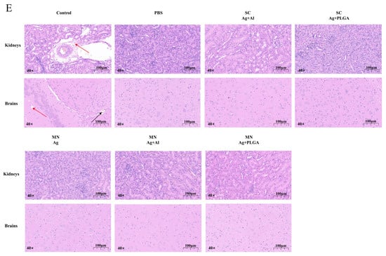 For pathological analysis, we used HE staining to observe the kidney and brain of mice at death or 7 d after toxin injection. Positive control mice were intraperitoneally injected with 100 × LD50; intraperitoneal injection of PBS was used as a negative control. Positive control mice lost mobility within 10 min of injection and were euthanized immediately when they were close to death. Pathological section results (Figure 6E) showed that the positive control mice had significant bleeding and edema in the kidney, and significant vacuolization, bleeding, and edema in the brain, while there were no pathological changes in the kidney and brain tissue of the negative control and immunized mice, except for the SC immunization Ag group. These results indicate that all immunization groups except for the SC immunization Ag group were protected from the toxin.