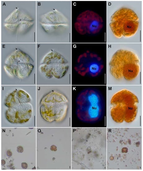Light micrographs of Karenia from laboratory cultures. Karenia papilionacea strain LOMME01 (A–D), K. papilionacea strain LOMME02 (E–H), and K. mikimotoi strain LOHABE01 (I–M). Field specimens of Karenia spp. from Lugol-fixed field samples (N–R). Micrographs of live specimens from cultures observed with differential interference contrast (A,B,E,F,I,J) were made with differential interference contrast; DAPI-stained specimens (C,G,K) with an epifluorescence and Lugol-fixed specimens (D,H,M) with bright field microscopy. Lugol-fixed specimens are from samples collected in Yeosu (N), Hakri (O), Magumpo (P), and Mijo (R). Note highlighted cellular features: apical groove in (A,B,E,F,I,J) (arrow); sulcal intrusion open to the epicone in (E) (arrowhead); cingulum displacement in (I) (white arrowhead); and nucleus (Nu). Scale bars represent 10 µm.