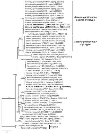 Maximum likelihood tree inferred from ITS sequences of Karenia species. Numbers above the nodes represent ML bootstrap supports (left, LBS) and Bayesian posterior probabilities (right, BPP) higher than 60% and 0.7, respectively. Robust statistical supports (100 of LBS or 1.0 of BPP) are indicated by an asterisk (*).