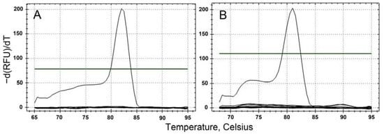 The specificity of the designed primer pairs targeting the two toxic dinoflagellates, K. papilionacea (KpSF-KpSR) and K. mikimotoi (KmF-KmR), was determined by performing qPCR assays on target and non-target algal species. Each primer pair amplified only the target species (Table 2). The melting temperature was approximately 81 °C for K. papilionacea and 80.5 °C for K. mikimotoi (Figure 3). In addition, as a result of sequencing all positive qPCR products, the sequences were found to be 100% identical to the target gene sequences of the two dinoflagellate species.