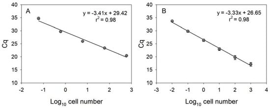 Linear standard curves derived from 10-fold serially diluted DNA purified using known numbers of K. papilionacea (A) and K. mikimotoi (B). The lower-case X and y-axis represent a log10 of cell number and mean (±SE) Cq value, respectively.