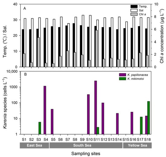 Temperature, salinity, and Chl-a concentrations (A) and abundances of K. papilinocea and K. mikimotoi (B) at each site along the Korean coast in September 2017.