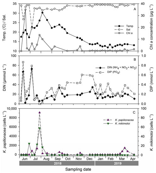 To investigate seasonal fluctuations in the two Karenia species, weekly monitoring was conducted at S5 from June 2018 to April 2019 (Figure 7). During this period, the water temperature ranged from 11.9 to 30.3 °C, with the highest temperature occurring on 3 August 2018, and the lowest on 1 February 2018. The salinity ranged from 22.1 to 34.7 with sharp drops on June 11 and July 5, 2018, due to heavy rainfall. The chlorophyll-a concentration ranged from 0.08 to 35.06 μg L−1, with the highest value recorded during an Akashiwo sanguinea bloom in June 2018. The abundance of K. papilionacea peaked five times during the study; the highest peak (9289 cells L−1) was recorded on 26 July 2018, with a water temperature of 26.1 °C and a salinity of 32.8. In the case of K. mikimotoi, there were two peaks in summer (June and July), and the highest value was 921 cells L−1 on 26 July 2018. Interestingly, both Karenia species showed their highest abundance on the same date (26 July 2018). During the study period, the two Karenia species appeared under similar environmental conditions; occurrence temperature ranges were 16.7–30.3 °C for K. papilionacea and 17.2–30.3 °C for K. mikimotoi, and the corresponding salinity ranges were 22.1–33.6 and 31.5–34.2, respectively (Figure 7).