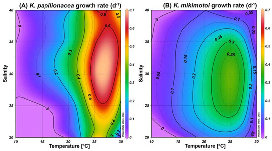 To understand the similar eco-physiological traits of the two species in the field, we investigated their growth responses under different temperature and salinity conditions in cultures. The highest specific growth rate of K. papilionacea was observed at a temperature of 25 °C and a salinity of 30 (Figure 8). This dinoflagellate was able to grow well at higher temperatures (25 and 30 °C) regardless of the salinity level. The growth rate of K. mikimotoi was generally lower than that of K. papilionacea (Figure 8). Notably, in addition to the field observations, both Karenia species showed similar physiological responses to temperature and salinity (Figure 9).
