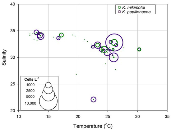 Relationships among temperature, salinity, and cell abundances (cells L−1) of Karenia papilionacea and K. mikimotoi in Korean coastal waters.
