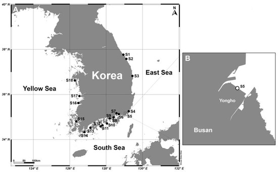 Map showing sampling sites during a nationwide survey along Korean coastal waters in September 2017 (A). Weekly monitoring was conducted at site 5 (S5) from 2018 to 2019 (B).