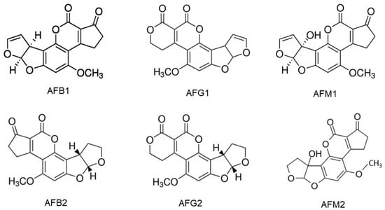 Aflatoxins are synthesized by Aspergillus flavus and A. parasiticus. A. flavus produces B aflatoxins, while A. parasiticus produces both B and G forms [3]. Aflatoxins B1, B2, G1 and G2 are naturally biosynthesized and frequently detected in cereal grains, particularly, maize, while the hydroxylated metabolites of AFB1 and AFB2 are aflatoxin M1 (AFM1) and M2 (AFM2) which are present in the meat, eggs, milk and cheese produced from animals which ingested aflatoxin-contaminated feed [30]. AFM1 is the major metabolite of AFB1 in milk from nursing humans and animals that consume AFB1-contaminated food or feed [4]. The chemical structures of AFs are shown in Figure 1. They are slightly soluble in water with a solubility of 10–20 µg/mL and completely soluble in moderately polar solvents such as chloroform, menthol and dimethyl sulfoxide [24]. The low hydrophilicity and high hydrophobicity of AFs enable them to bind to cell membrane lipids easily.