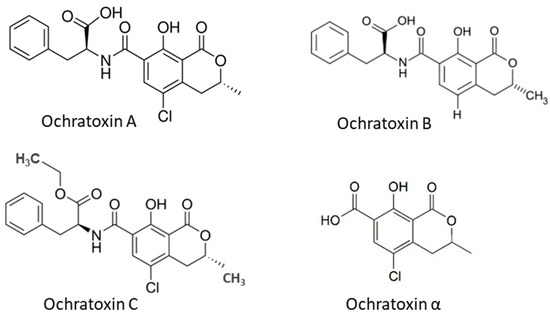 Ochratoxins (OTs) are produced by certain Aspergillus species and some Penicillium species, including A. ochraceus, A. alliaceus, A. auricomus, A. carbonarius, A. glaucus, A. melleus, A. niger, P. nordicum and P. verrucosum among them [4,34]. The main forms of OTs are ochratoxin A, B and C, which differ in chemical structure and toxicity. Ochratoxin B (OTB) is a non-chlorinated form of OTA and ochratoxin C (OTC) is an ethyl ester of OTA formed in the presence of rumen fluid [8]. Among these ochratoxins, OTA is the most prevalent and toxic followed by OTC and OTB [35]. OTα is a non-toxic metabolite of OTA. The OTA has been found in several types of cereals, including corn, wheat, barley, rye, rice and other plant products such as coffee beans, dried fruits and spices. The chemical structures of OTs (Figure 2) show that all OTs contain a non-polar end and several polar groups on the side chain; thus, they can bind to membrane lipids and proteins such as plasma albumin [22,36].