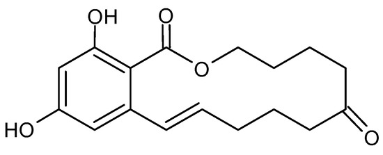 ZEA is produced by fungi of the genus Fusarium spp., including F. graminearum, F. culmorum, F. cerealis, F. equiseti, F. crookwellense, F. semitectum, F. verticillioides, F. sporotrichioides, F. oxysporum and F. acuminatum [26], but mainly F. graminearum and F. culmorum [42]. Corn has been described as the most vulnerable food to ZEA contamination. Other food crops, including wheat, barley, oat and rye, have also been found with this toxin. ZEA is immunotoxic, hepatotoxic and xenogenic [26]. The chemical structure of ZEA consists of a resorcinol moiety fused to a 14-member macrocyclic lactone ring with a trans double bond, two hydroxyl groups, two ketones and one methyl branch (Figure 3), which allow it to be easily absorbed through the gastrointestinal tract, to interact with proteins and lipids in the biological system to exert its toxicity [43,44]. The ZEA induces histopathological changes in the liver, with the subsequent development of liver cancer; it exerts hematotoxic effects by disturbing blood coagulation and modifying blood parameters. ZEA and its derivatives are non-steroids but have estrogenic activity in mammalian animals. They bind to estrogen receptors of cells and inhibit the secretion of steroid hormones, interfere with the estrogen response in the pre-ovulatory phase, and inhibit follicle maturation in mammals; this leads to disorders of the hormonal balance of the body, and, subsequently, many diseases of the reproductive system [43,44]. Higher concentrations of ZEA cause permanent estrus, pseudo-pregnancy and infertility in animals [44]. The detail toxicity of ZEA in humans and animals has been extensively reviewed by Ropejko and Twarużek [26] and is not discussed in this review.