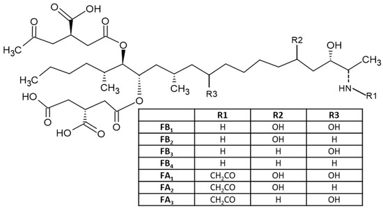 Fumonisins (FUMs) are produced in cereals by different species of Fusarium including F. verticillioides, F. proliferatum and F. fujikuroi, and other related species; they are common contaminants of maize and to a lesser extent of wheat and other cereals [45]. Fumonisins consist of a long hydrocarbon backbone chain similar to that of sphinganine. Six forms of fumonisin including FA1, FA2, FB1, FB2, FB3 and FB4 have been identified, with FB1 being the most toxic [4]. All FUMs are water soluble and thus are polar [24], which is determined by their chemical structures (Figure 4). These toxins are cytotoxic and carcinogenic to animals at relatively high concentrations. FB1, the major and most-studied fumonisin, is nephrotoxic and hepatotoxic in several animal species and has been classified as a possible carcinogen to humans (Group 2B) [24]. FB1 has been reported to cause leukoencephalomalacia (LEM) in horses, pulmonary edema syndrome (PES) in pigs and liver cancer in rats and hepatotoxic to horses, pigs, rats and vervet monkeys. The FB1 is cytotoxic to mammalian cell cultures and phytotoxic to several plants. FUMs have also been reported to be linked to human esophageal cancer in Transkei, China and South Africa [20,21,22,23,46].