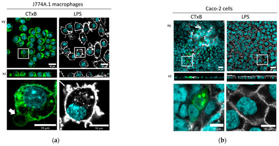 The selection of LPS dose (1 µg/mL) and incubation time (24 h) was determined based on our previously published data, wherein we demonstrated the J774A.1 macrophage membrane remodeling and inflammatory response to the LPS [18]. In vitro studies on Caco-2 cells demonstrated that 1 µg/mL LPS modulates cells’ morphology and instigates the inflammatory response without causing cell death. For the choice of CTxB experimental conditions, we relied on the published findings of Schnitzer et al. [12] and Phongsisay et al. [13]. These studies provided valuable insights into the optimal conditions for studying the effects of CtxB on cellular responses.
