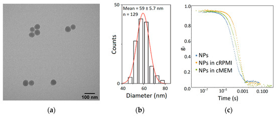 SiO2-Bodipy fluorescein (BDP FL) NP characterization. (a) Transmission electron micrograph of SiO2-BDP FL NPs (dTEM = 59 ± 6 nm). (b) Core diameter distribution of 59 nm SiO2-BDP FL NPs. Statistical analysis and graphical presentations were performed using the software Origin 2016 (OriginLab Corporation, Northampton, MA, USA). (c) The correlation functions of DLS measurements performed in Milli-Q water and supplemented medium at 24 h indicate stabile NP suspension. The data were obtained and analyzed by following a previously described method [30,31].