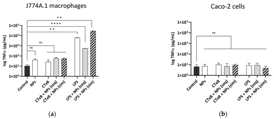 CTxB and LPS effect on TNF-α cytokine secretion. The secretion of pro-inflammatory mediator TNF-α by (a) J774A.1 cells and (b) Caco-2 cells after single, sequential (seq), and simultaneous (sim) co-exposure with NPs. The data for TNF-α secretion are obtained via ELISA and represented in pg/mL. The controls denote the mean values of the untreated cells. Data are presented as mean ± standard deviation (n = 3), analyzed via one-way ANOVA with Dunnett’s post hoc test for multiple comparisons; ns—not significant; ** p ≤ 0.01; **** p ≤ 0.0001.