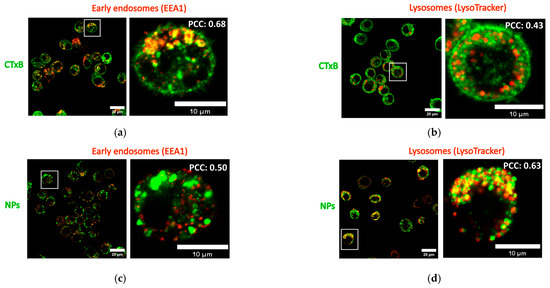 In the previous section, we described colocalization between CTxB and NPs during both simultaneous and sequential co-exposure, suggesting a possibility for their uptake through shared entry mechanisms, such as the clathrin-/caveolin-dependent or clathrin-/caveolin-independent pathways [9,37]. In this section, our objective is to investigate whether CTxB and NPs are localized within the same intracellular compartments. Upon deposition at the cell membrane, the NPs are internalized via endocytic mechanisms, then pass through early/late endosomes and accumulate in the lysosomes [38,39]. However, in contrast to NPs, CTxB can bypass lysosomes and accumulate in the endoplasmic reticulum or Golgi apparatus [19]. With this in mind, a colocalization of SiO2-BDP FL NPs and CTxB with early endosomes and lysosomes was investigated at 24 h upon exposure to J774A.1 macrophages. Following CTxB internalization, the pathways coalesced within early endosomes as evidenced by a Pearson’s correlation coefficient of 0.68 (Figure 6a). Consistent with the previous publications [40], CTxB was able to partially bypass lysosomes, as evidenced by the lower colocalization between CTxB and lysosomal staining (PCC: 0.43) (Figure 6b). In contrast, approximately half of the NP fraction already left early endosomes after 24 h of incubation (PCC: 0.50) (Figure 6c) and ended up in lysosomes (PCC: 0.63) (Figure 6d). This observation correlates well with our previous publications, showing a significant accumulation of 59 nm SiO2-BDP FL NPs in macrophage lysosomes at 24 h after exposure [18,41]. The divergent intracellular localization of CTxB and NPs can be ascribed to differentiate mechanisms of their endosomal/lysosomal transport. Moreover, the dissimilarities in the extracellular and intracellular mobility of CTxB and NPs must also be considered. Despite this, colocalization between NPs and CTxB observed under both simultaneous and sequential co-exposure conditions led us to conclude that a subset of NPs may still be present in the same endocytic vesicles as CTxB. We postulate that a subset of NPs enters cells alongside CTxB and is then transported into early endosomes or recycled to the cell membrane together with CTxB.