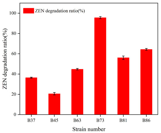 The strains were isolated from soil contaminated with petroleum using ZEN as the sole carbon source. Six strains, named B37, B45, B63, B73, B81, and B86, were found to be capable of degrading ZEN after three successive rounds of enrichment. Among them, strain B73 demonstrated remarkably efficient ZEN degradation, with a degradation rate of more than 95.6% after 24 h of incubation with 10 μg/mL ZEN in a minimal medium (MM) at 37 °C (Figure 1).