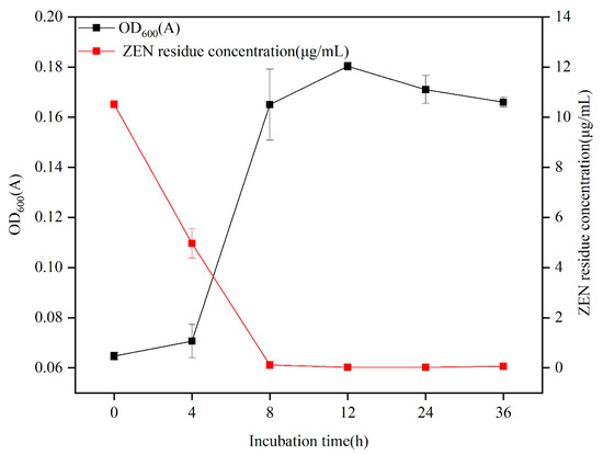 Strain B73 growth curve and ZEN degradation ratio. Data represent the mean ± SD of three independent replicates.
