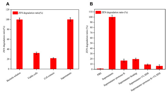 (A) Removal of ZEN by different fractions of strain B73; (B) ZEN degradation of cell-free supernatant after heating; SDS and proteinase K treatment. Data represent the mean ± SD of three independent replicates.