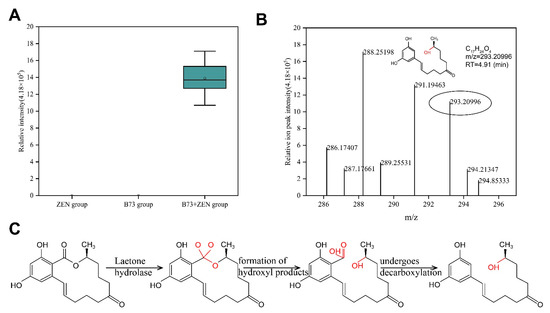 To further explore the ZEN degradation mechanism of extracellular enzymes produced by strain B73, we employed UPLC-Q-Exactive-MS to analyze the degradation products. Our analysis detected a potential degradation product in positive ion mode, which we named BP-1 (Figure 5A). BP-1 was not detected in samples that only contained ZEN or B73, thus confirming that the substance did not originate from these samples. However, BP-1 was found in samples of B73 + ZEN, suggesting that BP-1 was produced through the degradation of ZEN by B73 (Figure 5A). BP-1 has a predicted molecular weight of 292 g/mol and its mass spectrum is consistent with the molecular formula of C17H24O4 (Figure 5B). The process by which lactone hydrolase degrades ZEN and produces degradation products follows a similar pattern [28]. We hypothesize that B73 degrades ZEN mainly through lactone hydrolase activity, which converts the C=O group at C11 of the oxygen-containing lactone ring of ZEN into two C-O groups. This leads to the original C-O bond breaking and the formation of a new C=O bond, which spontaneously undergoes decarboxylation to form the non-estrogenic degradation product BP-1 (Figure 5C). Thus, the BP-1 product obtained in our study is most likely the result of lactone hydrolase activity.