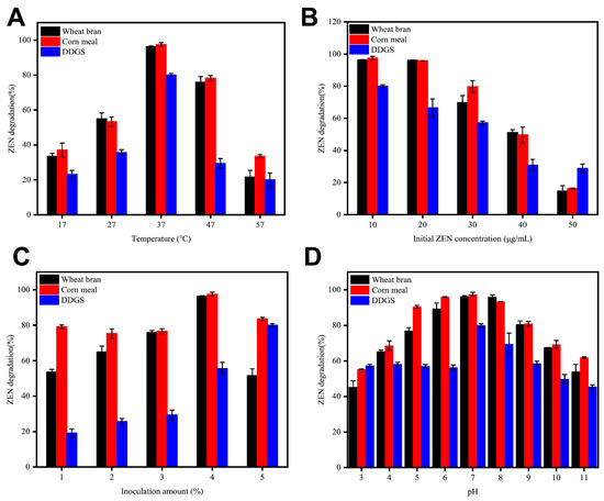 Effect of the medium conditions for strain B73 on ZEN degradation in wheat bran, corn meal and DDGS: (A) temperature, (B) initial ZEN concentration, (C) inoculation amount, and (D) pH. Data represent the mean ± SD of three independent replicates.