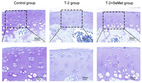 The toluidine blue staining of articular cartilage among different groups was shown in Figure 1. In the control group, the cartilage matrix was deep-purple and the chondrocytes were closely arranged. The cartilage matrix in the T-2 group was less colored and the number of chondrocytes was less than that in the control group. Compared with the T-2 group, the cartilage matrix in the T-2 + SeMet group was more stained, and the number of chondrocytes increased. These results suggested that the T-2 toxin degraded the cartilage matrix and reduced the number of chondrocytes, causing articular cartilage lesions, and SeMet effectively alleviated articular cartilage lesions.