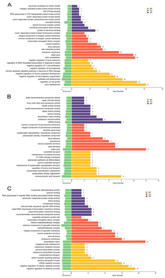 GO analysis of target genes. The top 30 GO terms of target genes in the T-2 group vs. the control group (A), the T-2 + SeMet group vs. the control group (B) and the T-2 + SeMet group vs. the T-2 group (C). The BP represents biological process, CC represents cellular component, and MF represents molecular function. The threshold of significance was p < 0.05, n = 3.