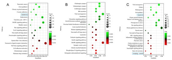 KEGG enrichment analysis identified pathways that were significantly enriched in apoptosis, and the MAPK and TGF-β signaling pathway in the T-2 group vs. the control group, of which the apoptosis pathway was the most significant (Figure 4A). The chemokine signaling pathway, growth hormone synthesis, and secretion and action pathway were enriched in the T-2 + SeMet group vs. the control group, but no apoptosis pathway was observed (Figure 4B). The apoptosis and autophagy pathway appeared simultaneously in the T-2 + SeMet group vs. the T-2 group (Figure 4C).