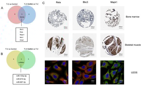 The Venn diagram displays the overlapping target genes and DE-miRNAs associated with apoptosis in the T-2 group vs. the control group (A) and the T-2 + SeMet group vs. the T-2 group (B). The threshold of significance was p < 0.05, n = 3. The immunohistochemical map shows the expression of proteins in the bone marrow and skeletal muscle, and the subcellular map shows the specific location of the proteins in U2OS cells (C).