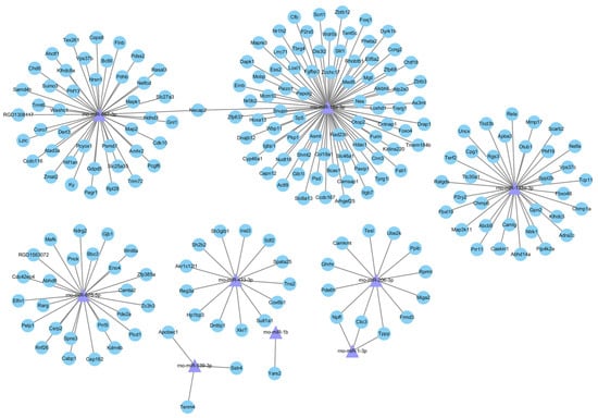 According to the targeting-binding relationship between miRNAs and target genes, a regulatory network was constructed and visualized using Cytoscape software (https://cytoscape.org/ (accessed on 20 May 2023)).