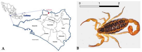 Distribution and morphology of the scorpion Centruroides possanii. (A) The orange dot indicates the geographical distribution and collection area of the scorpion C. possanii in Minatitlan, Colima, Mexico. (B) A female specimen of scorpion C. possanii. The scale bar 1:1 represents that 1 cm in the image equals 1 cm in reality.