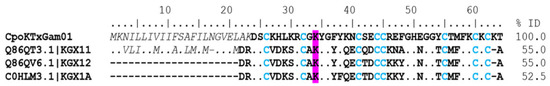 Alignment of gamma toxins acting on potassium ion channels. The signal peptide is shown in a gray color and italics. The mature peptide is shown in bold, and the cysteines forming the disulfide bridges are blue. Dots indicate identical amino acids. Highlighted in magenta is the amino acid involved with the binding site of the channel. The identity percentage (% ID) was estimated only for mature peptides.
