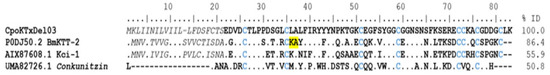 δ-KTx. The peptides of this subfamily have a Kunitz-type structural folding with protease activity and Kv1.3 potassium channel blockers [29]. According to this classification, ninety-four coding transcripts were identified. Still, only 12 sequences were complete. Of these, the coding transcripts (CpoKTxDel01-10) showed identity with the BmKTT-2 toxin (UniProt P0DJ50) from the scorpion Mesobuthus martensii, presenting an identical pattern of eight cysteines in their sequence, and were classified in group 1. Two coding transcripts (CpoKTxDel11 and 12) with sequences like the BmKTT-1 toxin (UniProt P0DJ49) from Mesobuthus martensii were found and categorized in group 2. The CpoKTxDel03 coding transcript shows 86% identity with the BmKTT-2 toxin and 55% and 50% identity with the Kunitz-type carboxypeptidase inhibitor Kci-1 (GenBank AIX8708, Androctonus bicolor) and Conotoxin precursor conkunitzin, partial (GenBank Uma82726, Conus ebraeus), respectively (Figure 7). The BmKTT-2 toxin inhibits trypsin and chymotrypsin and is a potent inhibitor of human plasmin, suggesting it may have good stability for oral drug delivery [30]. In contrast, the putative peptides of group 2, i.e., the CpoKTxDel11 and 12 showed 86% and 56% identity with peptides of Kunitz-type serine protease inhibitor LmKTT-1a-like from C. sculpturatus (NCBI XP_023242637) and Lychas mucronatus (UniProt P0DJ46), respectively, as well as 50% identity with venom protein VP5 (GenBank ALX72370) of Odontobuthus doriae [31] (Figure 8). Although the LmKTT-1a toxin completely inhibits trypsin activity, it does not affect chymotrypsin or elastase and blocks potassium currents in the Kv1.3 channel [29,32].