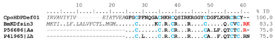Alignment of Host Defense Peptides of the Defensin type. In italics are the amino acids of the signal peptide, in bold are the mature peptides, and dots indicate identical amino acids. The conserved cysteine pattern is in blue, and the amino acids indicate cleavage (RK) in red. The percentages of identity (% ID) between sequences correspond to the mature peptide.