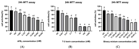Cell activities (%) of PK15 treated with different concentrations of AFB1 for 24 h (A); Cell activities (%) of PK15 treated with different concentrations of T-2 for 24 h (B); Cell activities (%) of PK15 treated with an AFB1 and T-2 combination for 24 h (C). Values with the difference superscripts (a–f) are significant differences (p < 0.05).