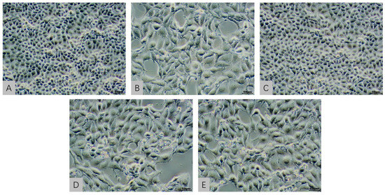 Micrograph of control cells (100×) (A); micrograph of 30,000-nMAFB1-treated cells (100×) (B); micrograph of 1.2-nM T-2-treated cells (100×) (C); micrograph of 30,000-nM AFB1- and 1.2-nM T-2-treated cells (100×) (D); micrograph of 23,272-nM AFB1- and 1-nM T-2-treated cells (100×) (E).